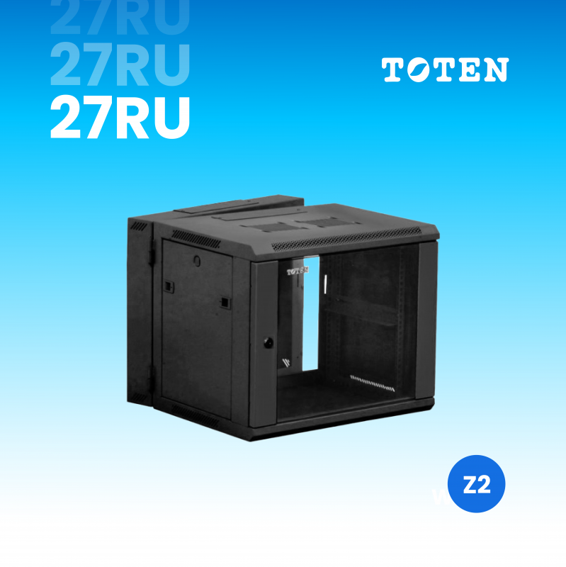 Gabinete de pared pivotable de 27 RU, diseñado para instalación estándar de 19”. Ofrece fácil mantenimiento posterior, estructura robusta y cumplimiento de normas internacionales.