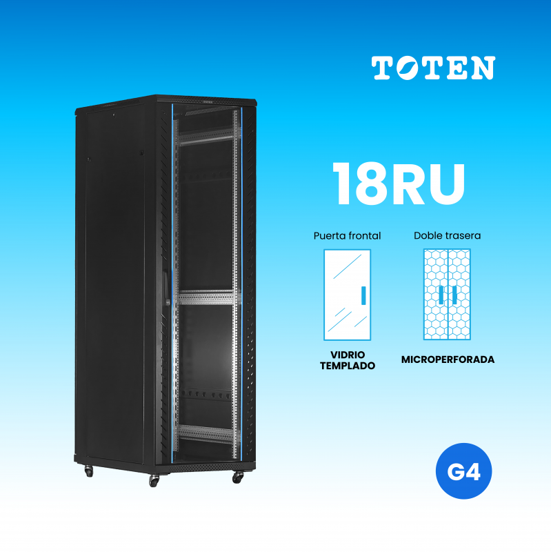 Gabinete de piso TOTEN de 18 RU, ideal para entornos que requieren soluciones compactas sin sacrificar funcionalidad. Su diseño con puertas microperforadas mejora la ventilación, mientras que sus ruedas con topes ofrecen estabilidad y facilidad de instalación.