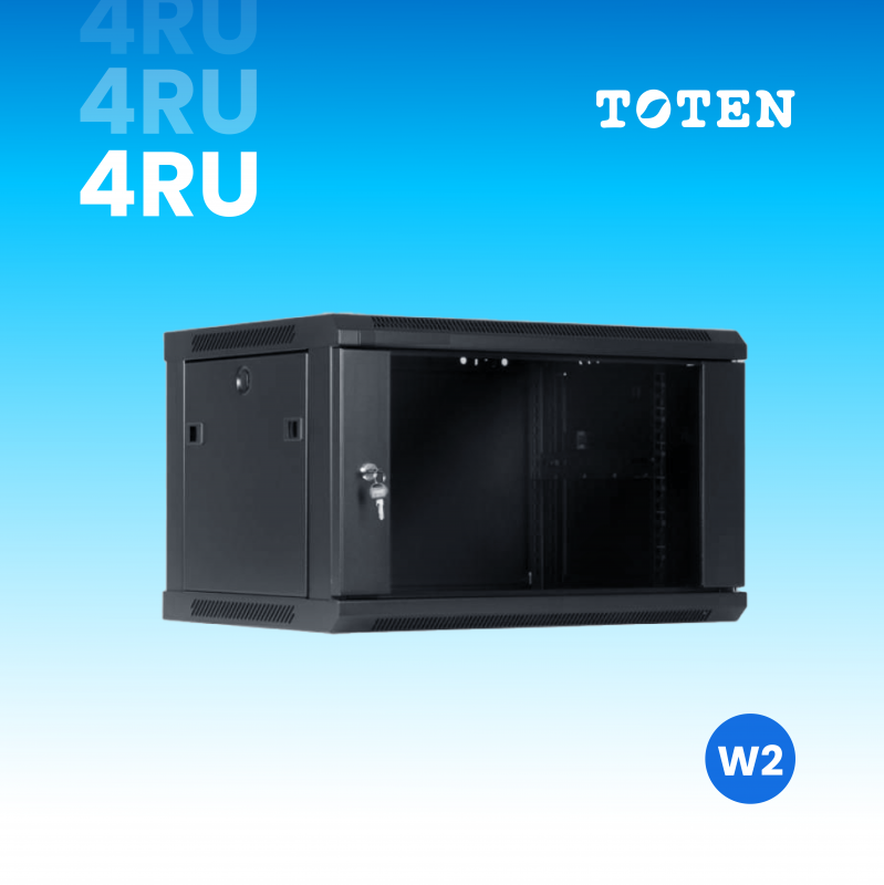 Gabinete de pared armado de 4RU W2.6404.9001 con estructura soldada y confiable. Ofrece instalación estándar de 19”, con acceso superior e inferior para cables. Cumple normas internacionales como ANSI/EIA RS-310-D, IEC297-2 y DIN41494.