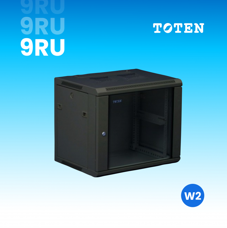 Gabinete armado no pivotable de 9RU W2.6409.9001 para instalación en pared o de pie. Cuenta con estructura soldada, acceso para cableado superior e inferior y cumple normas internacionales como ANSI/EIA RS-310-D e IEC297-2.