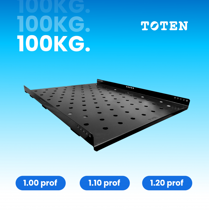 La bandeja fija pesada Toten SG.0365.1901 es ideal para gabinetes de 1.00, 1.10 y 1.20 m de profundidad. Fabricada en acero laminado en frío, está diseñada para soportar hasta 100 kg, brindando un soporte estable y seguro para equipos de alto peso en instalaciones profesionales.