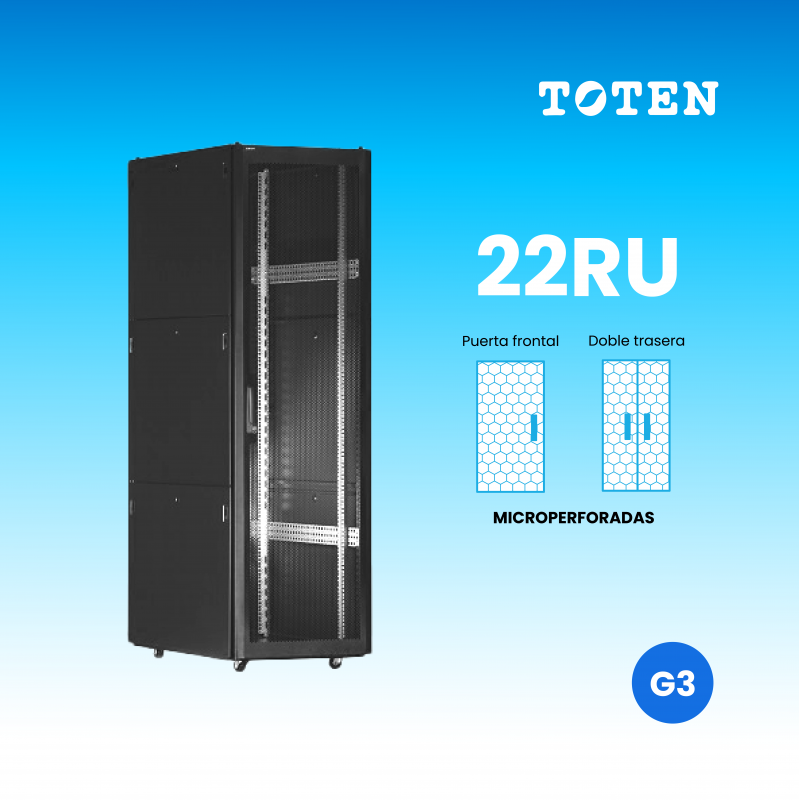 Gabinete de piso Toten de 22 RU con puertas microperforadas, paneles desmontables y ruedas resistentes. Diseñado para facilitar el mantenimiento, brindar ventilación eficiente y soportar cargas pesadas. Cumple con normas internacionales como ANSI/EIA RS-310-D e IEC297-2.